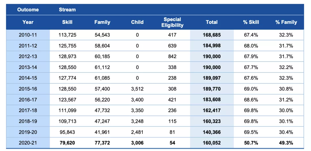 與過往財年相比,2020-21財年技術(shù)移民發(fā)放量進一步縮減,家庭簽證發(fā)放量大增。