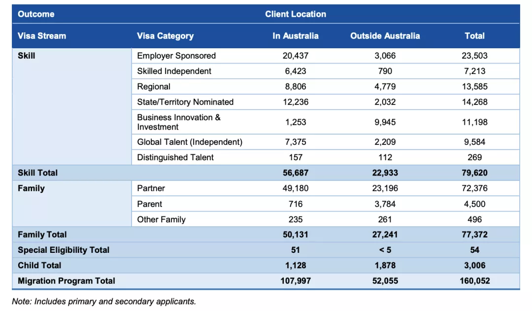 近日,澳洲移民局公布了2020-21財年的最新移民報告,截止2021年6月30日,該財年澳洲永久移民項目共發(fā)放了160,052個名額(原定配額為16萬個)。其中,技術(shù)移民共發(fā)放了79,620個名額;家庭簽證發(fā)放了77,372個名額,特別資格簽證發(fā)放了54個名額,兒童類簽證發(fā)放了3,006個名額。