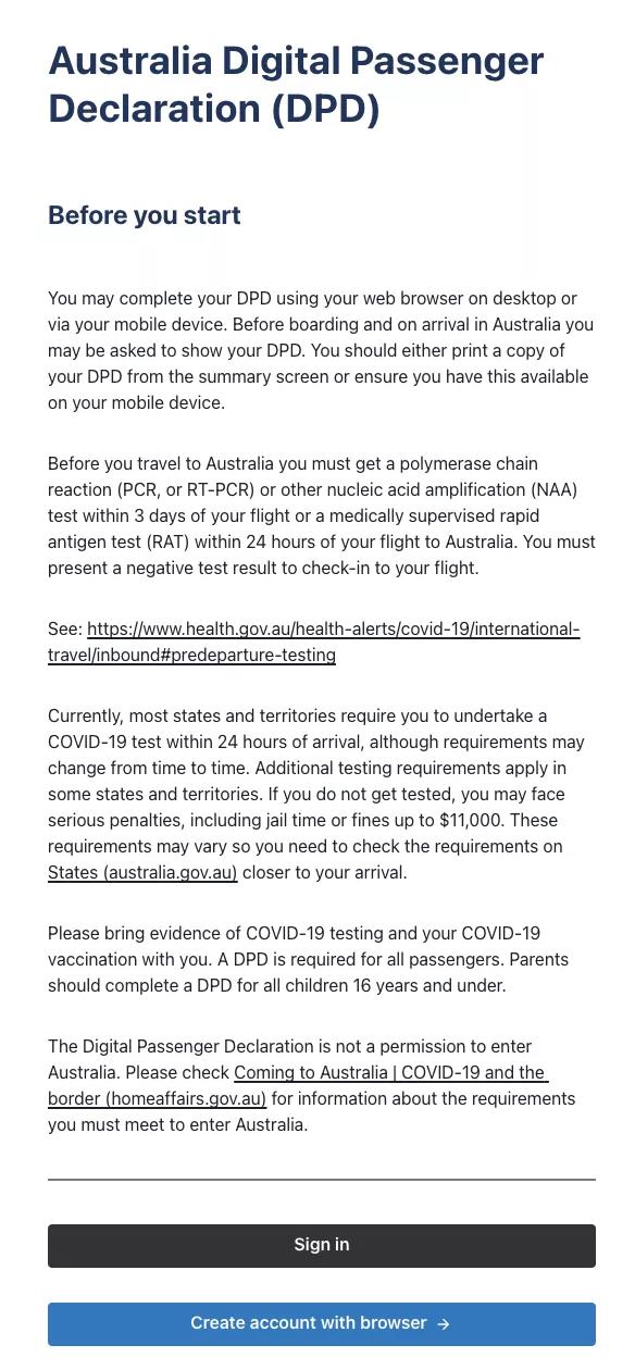 建議旅客開始填寫DPD之前,查看澳洲衛生署網站,了解旅客來澳洲時需要遵守的檢疫規則。由于澳洲各州和各地區的檢疫要求不同,所有旅客應同時檢查到達地和最終目的地的安排。