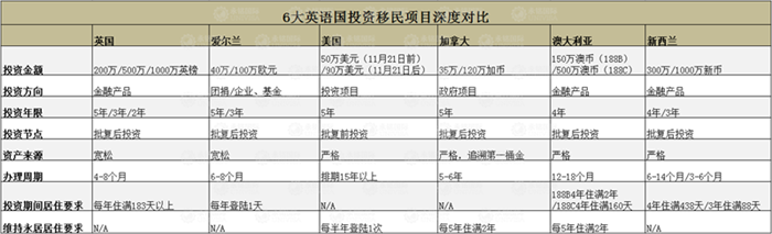 那么,全球6大英語國,各自的投資移民政策是怎樣的?哪國更適合您呢?小銘從移民家庭最關(guān)心的投資金額、投資期限、資金來源、辦理周期、居住要求等方面,詳細梳理了6大英語國投資移民項目深度對比表,供大家參考。