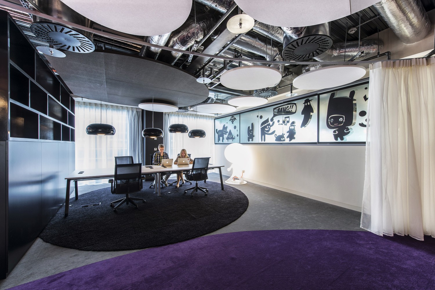 該辦公大樓由四座建筑組成,置身其中仿佛置身一個大型藝術館,為谷歌員工提供了一個絕佳的辦公及休閑空間。除了創新的辦公空間,還包括多個附加功能,如5個餐廳、42個微型廚房和交流中心、游戲室、健身中心、游泳館、會議學習和發展中心、技術站、超過400個非正式和正式的會議室和電話亭等。