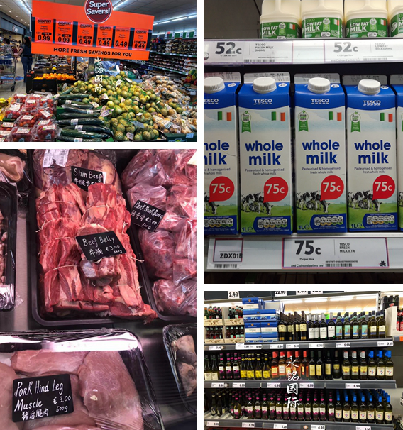 愛爾蘭超市食品種類齊全,各種肉、海鮮、蔬菜、水果、蛋、奶制品應(yīng)有盡有。愛爾蘭食品的物價并不貴,1L的牛奶通常只要1歐左右,1大袋吐司面包不到2歐,900g的雞翅差不多2歐,4歐就可以買到1只雞,新鮮的三文魚500g約8歐,藍龍蝦1kg約20歐,愛爾蘭的牛羊肉品質(zhì)很好,價格也適中。