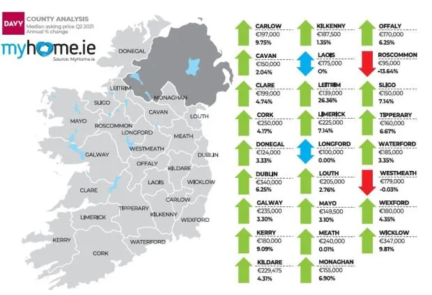 以下為2021年第二季度愛爾蘭各地區(qū)平均房價及上漲幅度。