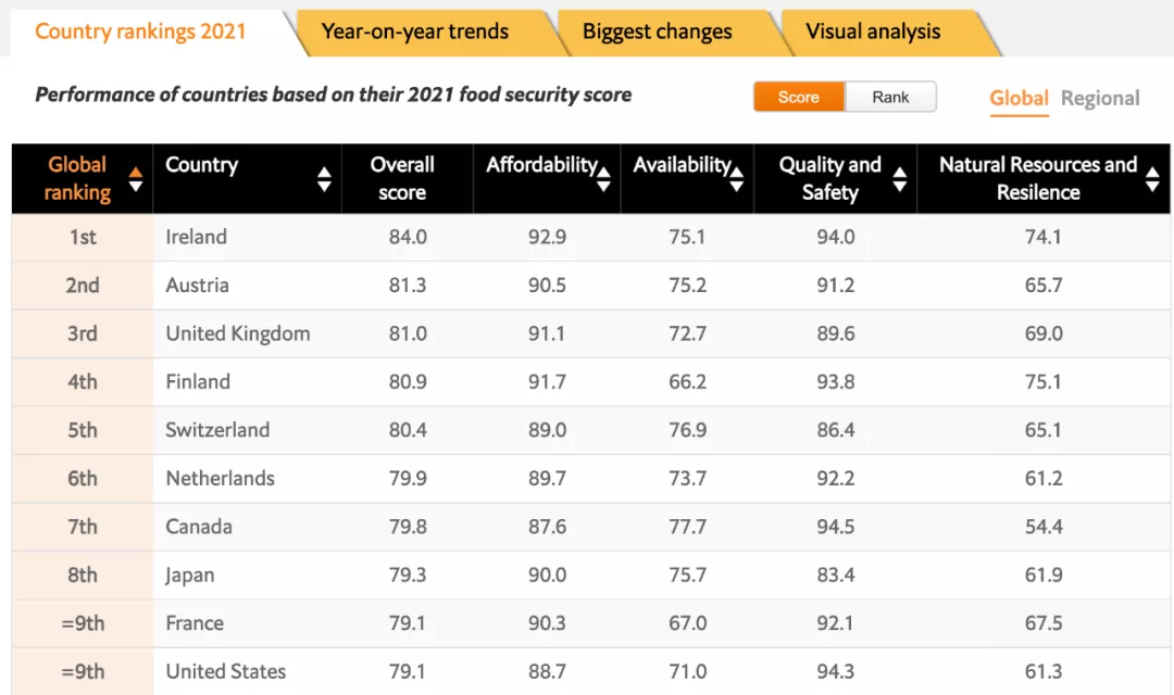 近日,全球知名雜志《經濟學人》(The Economist Group)發布了《2021全球食品安全指數》排名,愛爾蘭以84.0的綜合分數再次摘下全球第一的桂冠!中國以71.3的綜合分數排名全球第34位。