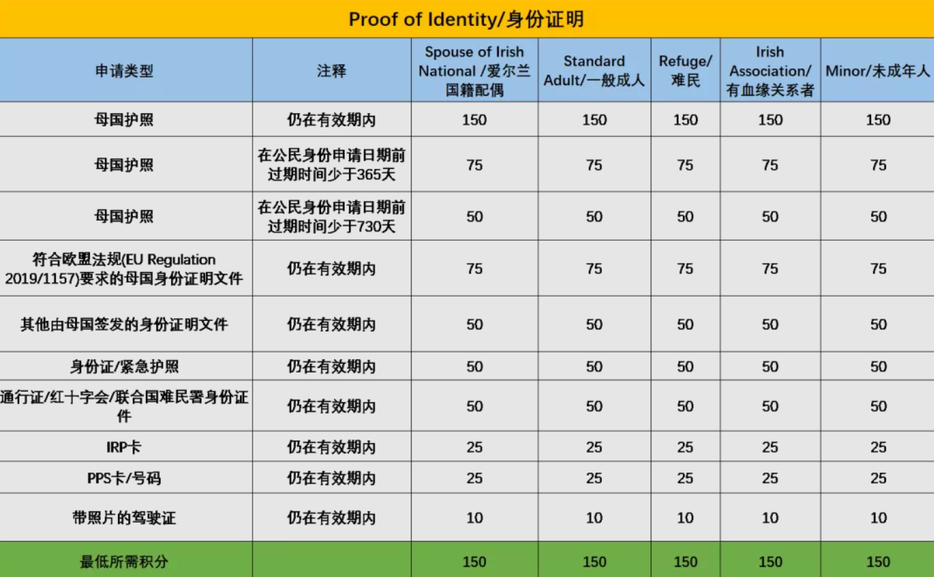 積分制的引入,使申請人更加明確需提供哪些文件證明,以成功獲取公民身份。根據愛爾蘭移民局官網公布的積分細則,申請者需要在身份認證(Identity)和居住證明(Residency)兩方面均滿足每年150分的積分要求。