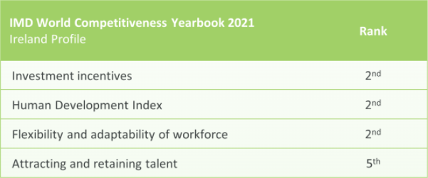 愛爾蘭長期位居世界上最適合商業(yè)發(fā)展的國家前列,有利于外商直接投資的增長。歷屆政府始終延續(xù)一致的親商政策。通過持續(xù)改善成本、生產(chǎn)力、生活質(zhì)量等營商環(huán)境情況,愛爾蘭較之其它發(fā)達(dá)經(jīng)濟(jì)體優(yōu)勢明顯。愛爾蘭投資激勵位居世界第2,生活質(zhì)量世界第2,員工靈活性與適應(yīng)度世界第2,吸引和留住人才世界第5。