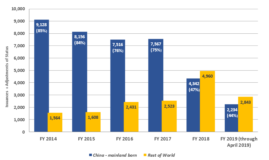 自2015財年中國大陸EB-5申請人開始出現排期后,2015財年中國大陸出生的申請人占用了8,156個簽證名額(占全球84%),2016財年為7,516個(占全球76%),2017財年為7,567個(占全球75%),2018財年為4,342個(占全球47%),截止到2019年4月份中國大陸僅分配了2234個簽證名額(占全球44%)。