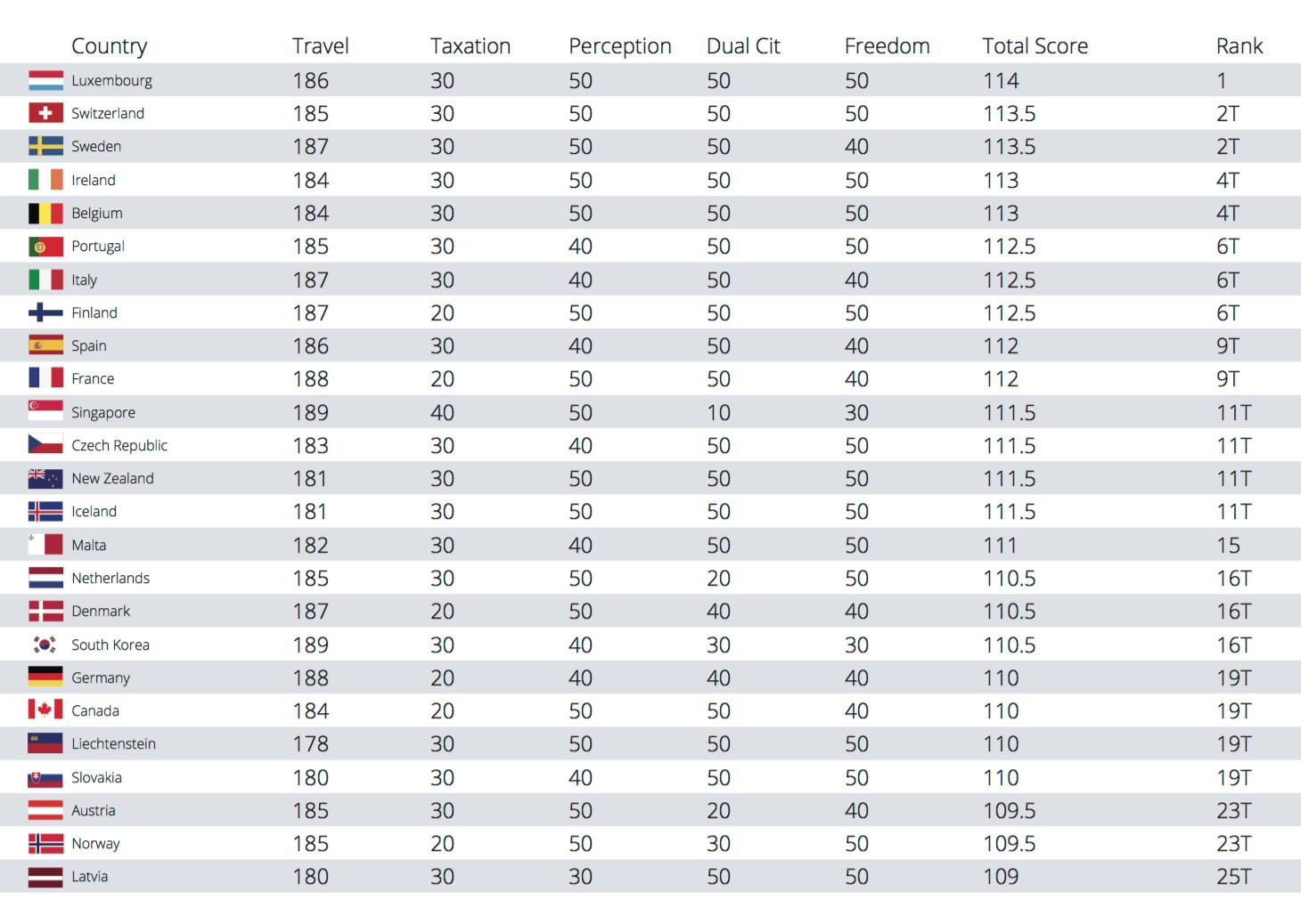 該排名中盧森堡奪魁,前十名均是歐洲國家,前二十名除了新加坡、新西蘭、加拿大和韓國,也均為歐洲國家。其中第二名是瑞士,第三名瑞典,第四名愛爾蘭,第五則為比利時。中國排名第130。