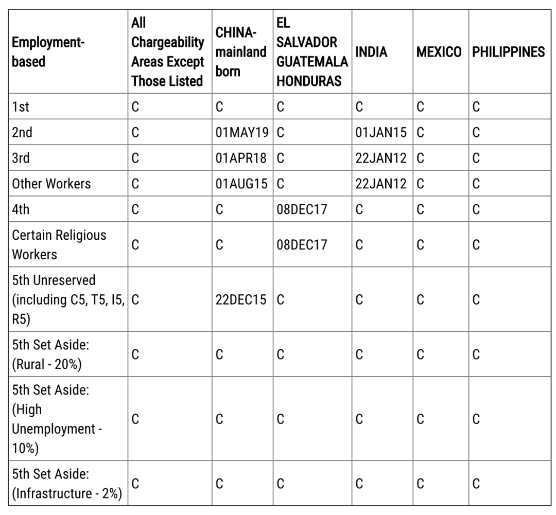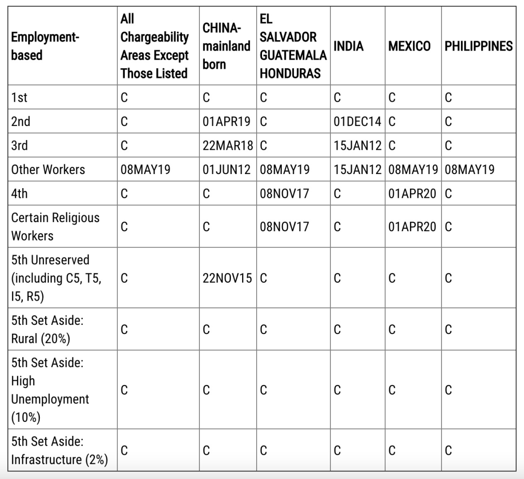 ·表B同樣除EB-2前進1個月至2019年5月1日,其他各類簽證項目排期無變化。