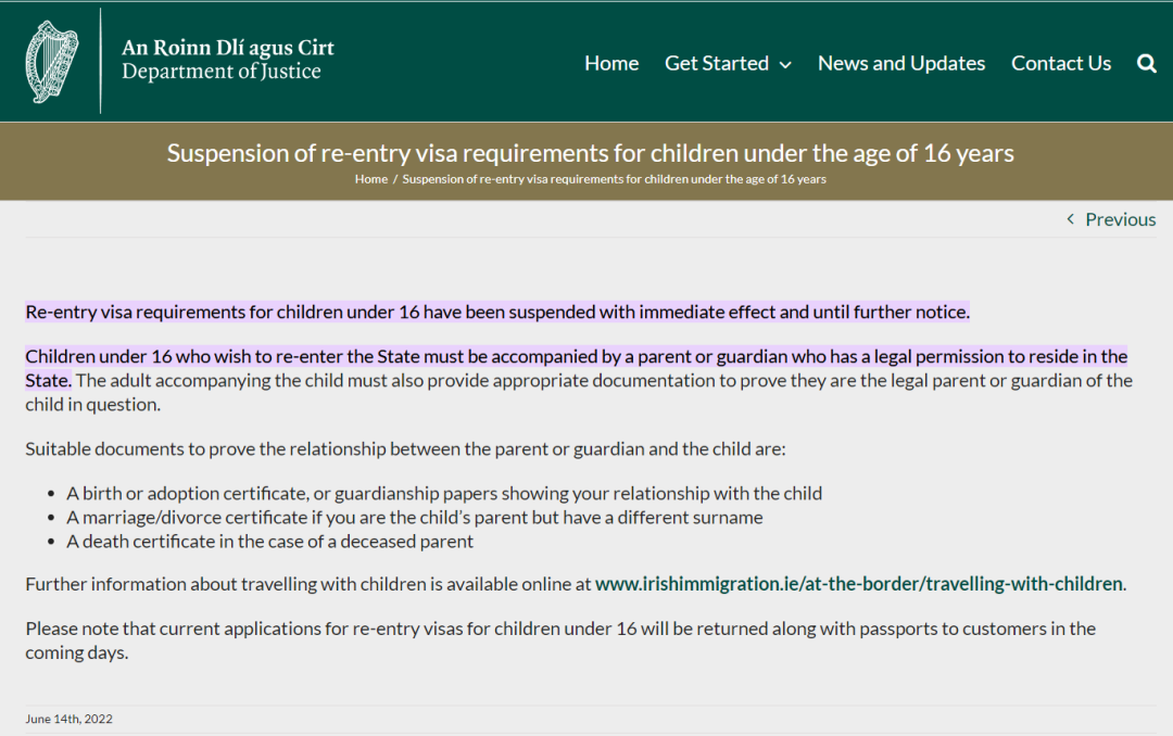 6月14日,愛爾蘭司法部門和移民局發(fā)布通知稱,取消對16歲以下兒童再次入境愛爾蘭的簽證要求,并表示該規(guī)定立即生效,直至進(jìn)一步通知。