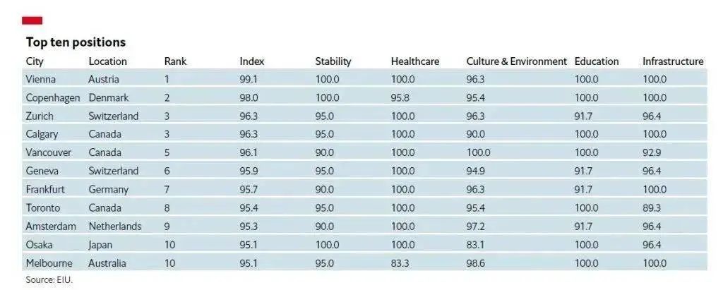 近日,英國經(jīng)濟學人智庫發(fā)布了“2022年全球最宜居城市”排行榜。