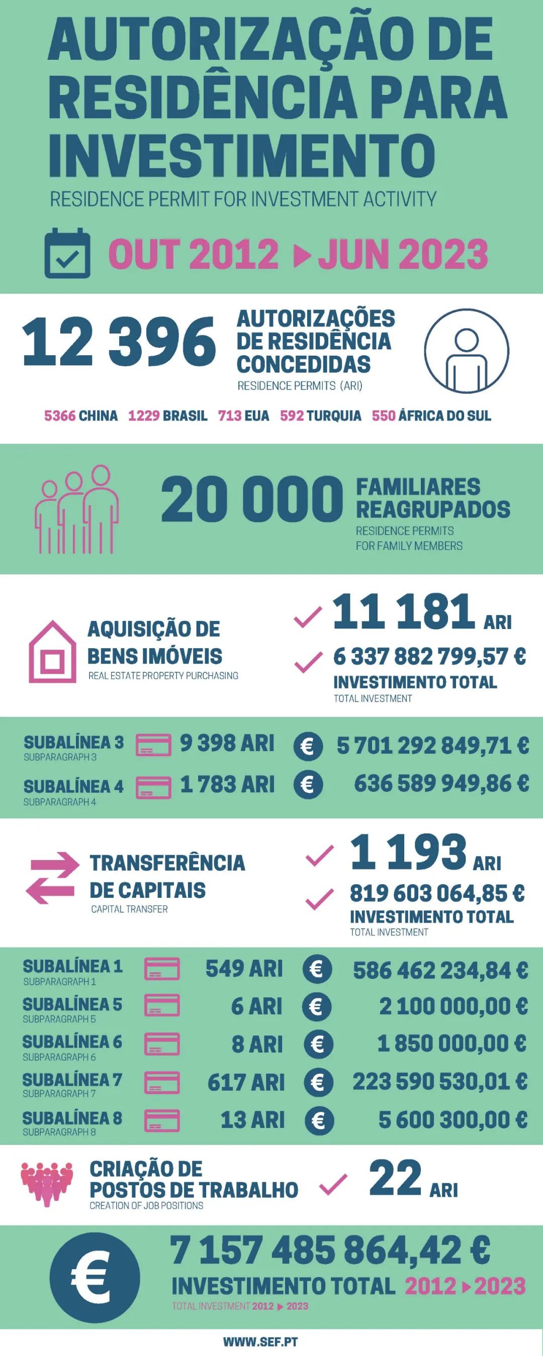 7月5日葡萄牙移民局(SEF)公布了2023年6月份的黃金簽證數據。6月共有179位主申請人和192位附屬申請人獲批葡萄牙黃金簽證。獲批總人數為371人,總投資額約7988萬歐元。
